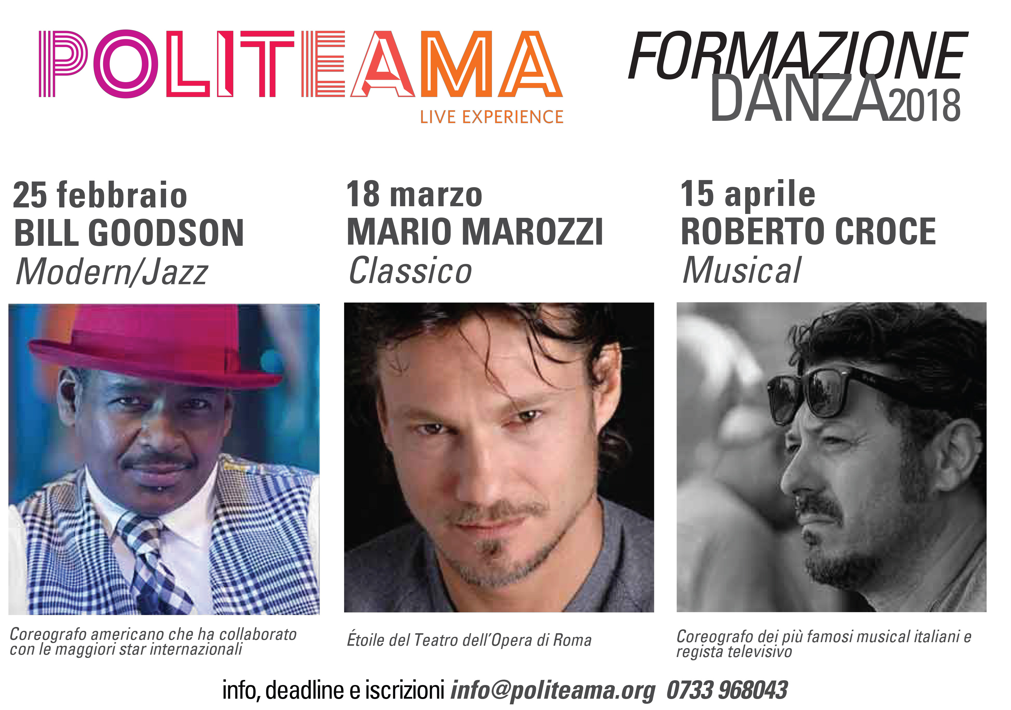 Formazione Danza 2018 è il progetto che il Politeama dedica alla danza nelle sue diverse discipline. Tre giornate di stage con insegnanti di fama nazionale e internazionale. Il 15 aprile si svolgerà quello dedicato al Musical e sarà tenuto da Roberto Croce, coreografo dei più famosi musical italiani e regista televisivo. I partecipanti saranno divisi in classi di studio Intermedio (8-12 anni) e Avanzato (+ 13 anni). Il programma prevede due lezioni, la prima ore 11-12.30 per i partecipanti di livello intermedio, la seconda ore 14-15.30 per i partecipanti di livello avanzato. Le lezioni si terranno nei locali della Sala Polivalente del Politeama, uno spazio attrezzato con parquet tecnico adatto alla danza e dotato di tutti i confort necessari a vivere un’esperienza formativa di alto livello. L’iscrizione, del costo di 50€ per ciascuna lezione, è obbligatoria e può essere effettuata inviando un’e-mail all’indirizzo info@politeama.org entro il 12 aprile 2018.